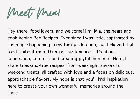 Hi, I’m Mia I share easy, family-friendly dinner recipes you can count on. As a self-taught home cook, I focus on simple ingredients, cozy comfort food, and meals that actually get made again and again.