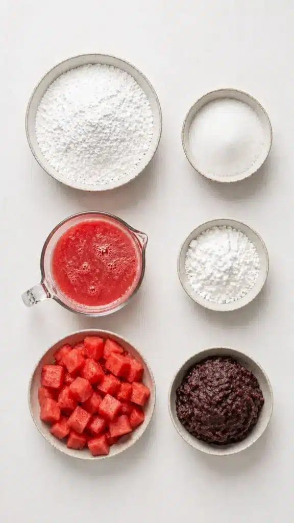Making watermelon mochi feels like capturing summer in your kitchen. Start by preparing the watermelon—blend fresh chunks and strain the juice to remove pulp. Set aside a few small cubes for the filling, making sure they’re dry so the mochi holds together well.
