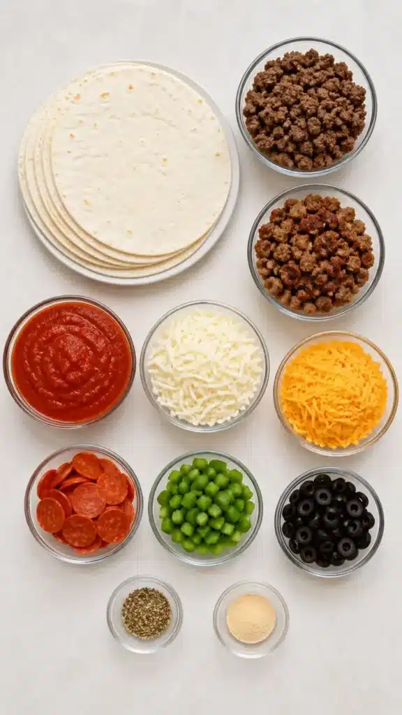 In a skillet over medium heat, cook the ground beef and beef sausage until browned and fully cooked. As it cooks, you’ll notice that rich, savory aroma building—it’s the base that gives pizza enchiladas their hearty flavor. Drain any excess grease and stir in a bit of pizza sauce along with the Italian seasoning and garlic powder.