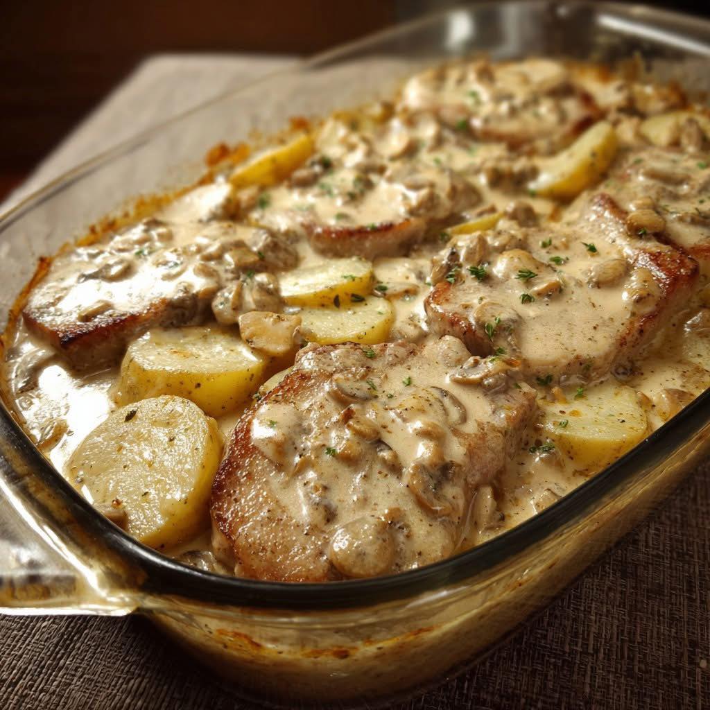 Ingredients:4 boneless pork chops4 medium potatoes, thinly sliced1 envelope Lipton onion soup mix1 can (10.5 oz) cream of mushroom soup1/2…