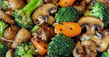 A vibrant, savory vegetable stir-fry featuring tender mushrooms, crisp broccoli florets, and sweet...