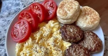 Breakfast Feast with Scrambled Eggs, Sausage Patties, Biscuits...