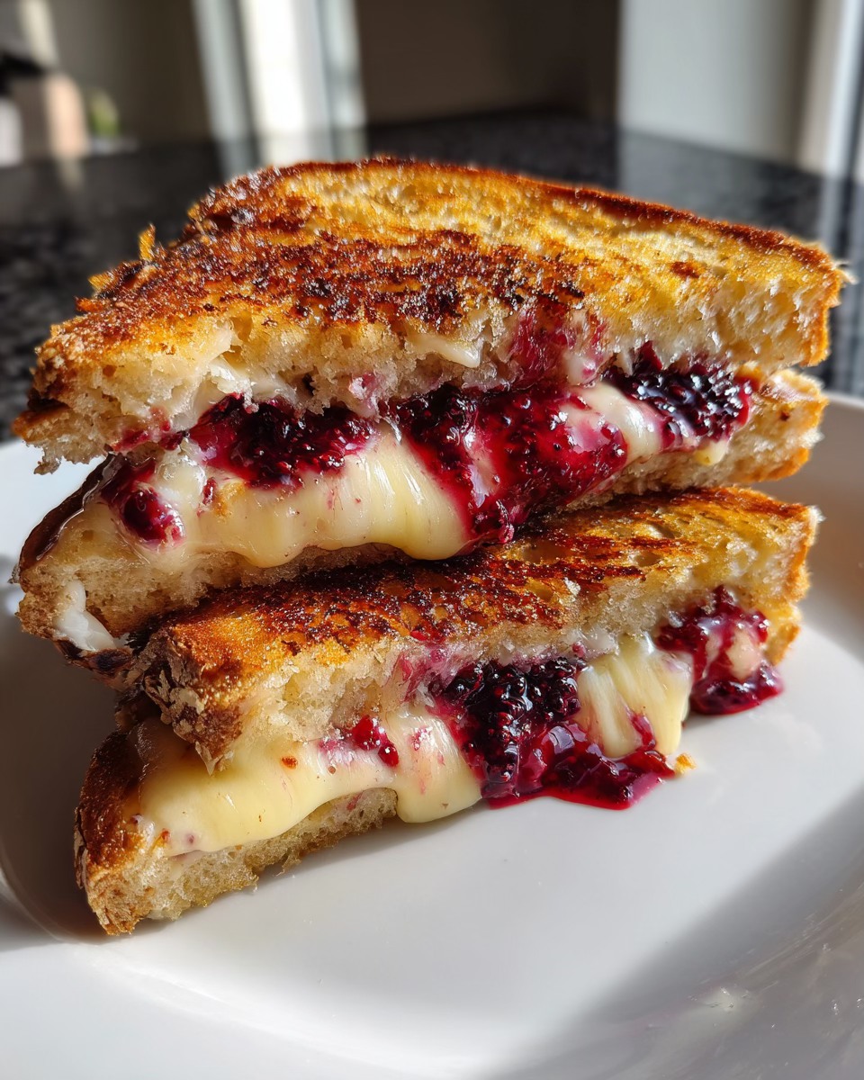 A sweet and savory grilled cheese sandwich with creamy brie and blackberry jam.