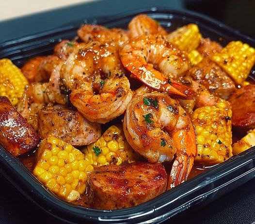 9. Pour the garlic butter sauce over the seafood boil and mix well.