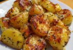 Spread seasoned potatoes in a single layer and roast for 20–25 minutes, flipping once halfway through, until starting to crisp and brown.