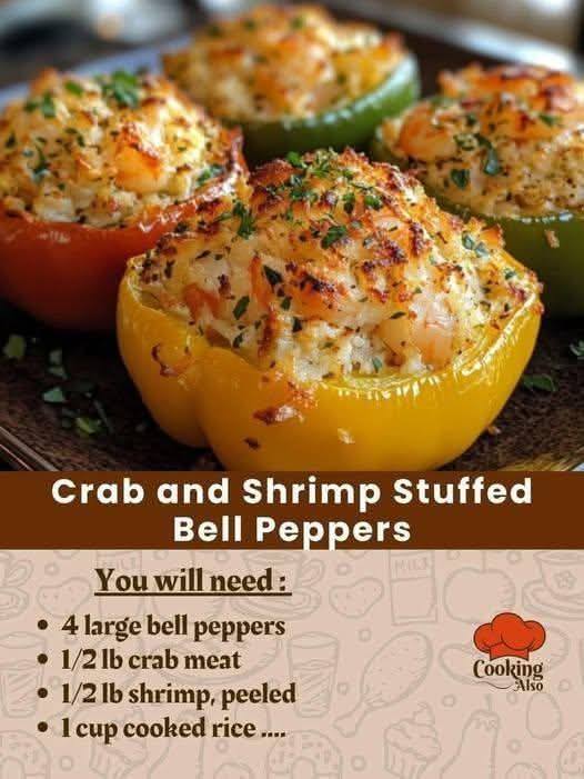Stuff Peppers: Fill each bell pepper with the crab and shrimp mixture. Place the stuffed peppers in a baking dish.