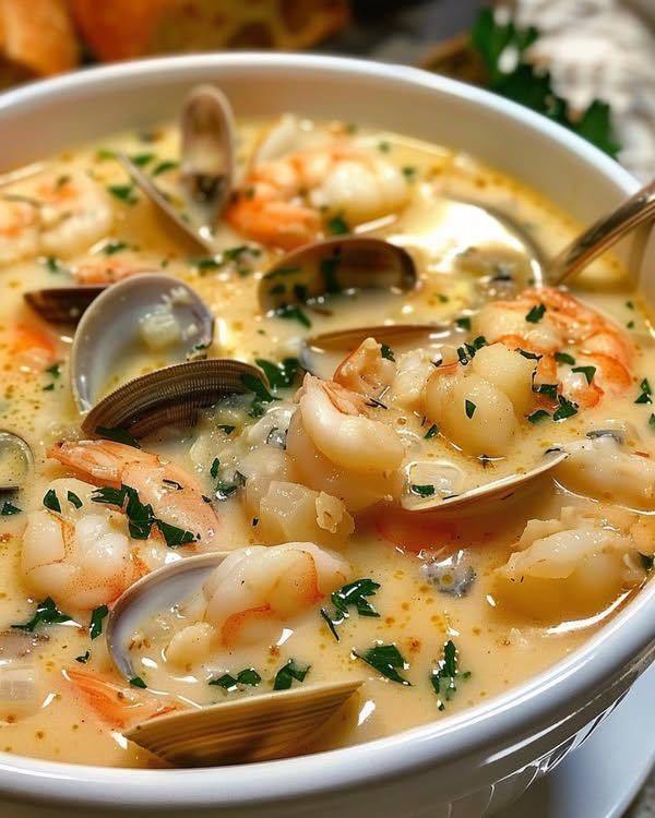 Slowly whisk in the broth, then pour in the heavy cream and milk. Bring to a simmer.