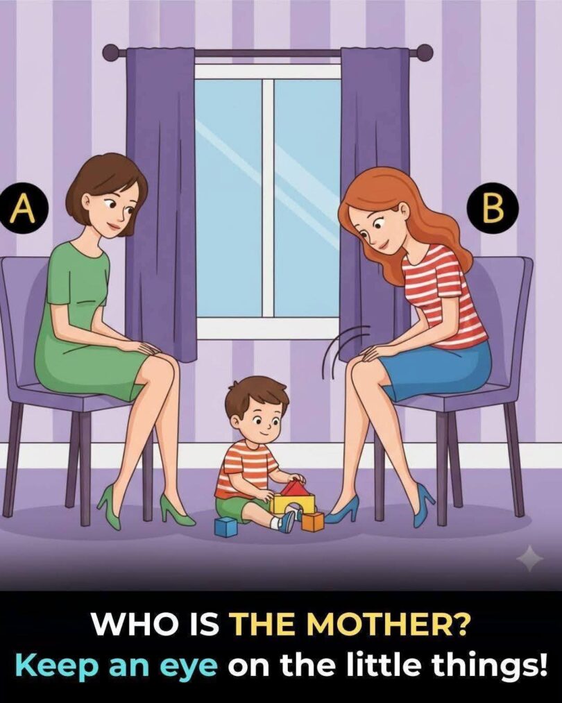 Second, the child’s body orientation provides a strong clue. Even while playing, his torso and general positioning are directed more toward Woman A. Young children instinctively gravitate toward the person they feel safest with, and their body language often reflects that subconscious comfort.