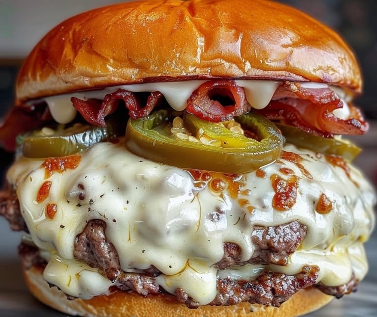 13. Place the top half of the bun on each burger and serve hot. Enjoy your Double-Decker Jalapeño Popper Smash Burger with Ranch Drizzle!