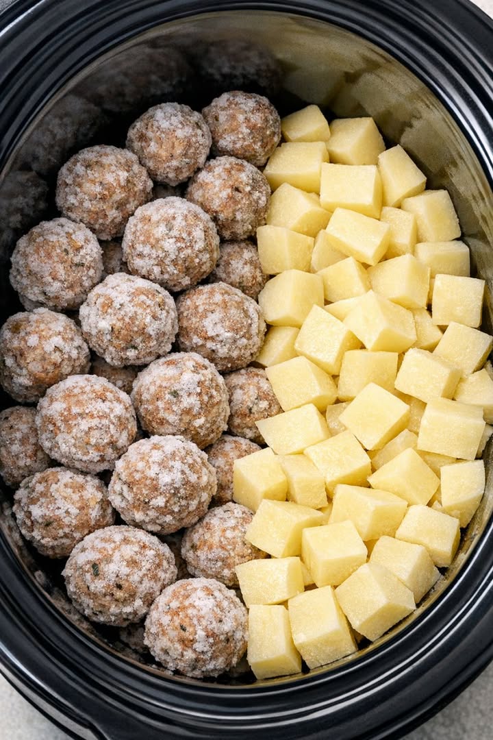 Pour the frozen meatballs directly on top of the potatoes, distributing them so they’re in a mostly single layer. Do not thaw the meatballs first; they go in straight from the freezer.