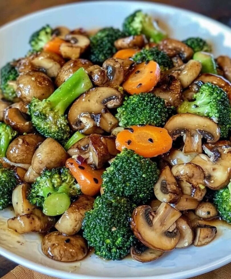 A vibrant, savory vegetable stir-fry featuring tender mushrooms, crisp broccoli florets, and sweet carrots tossed in a glossy garlic-soy sauce. Perfect as a side dish or a light main served over rice or noodles!
