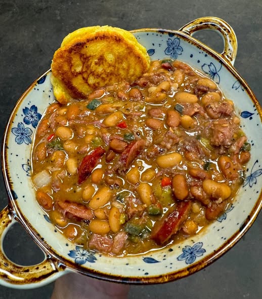 Remove bones from pot. Using a food processor blend 1.5 cup of the beans and add back to pot.