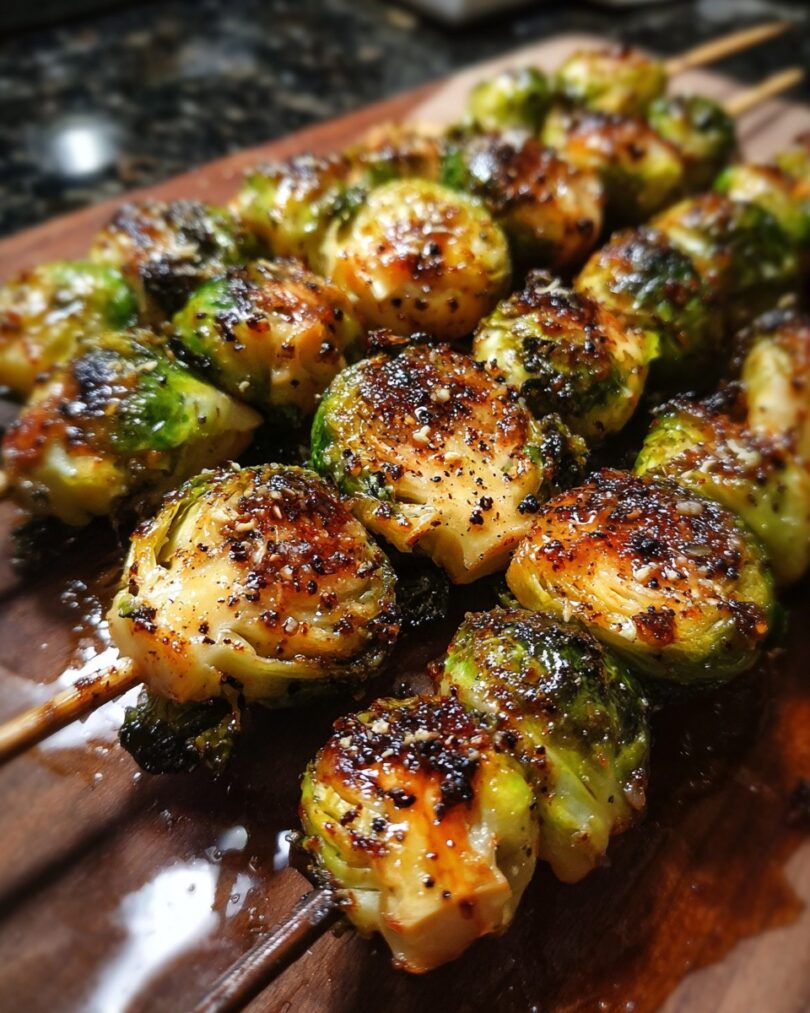 Brush skewers generously with half of the maple-Dijon glaze. Roast or grill for 18–20 minutes, flipping once, until sprouts are golden and tender.