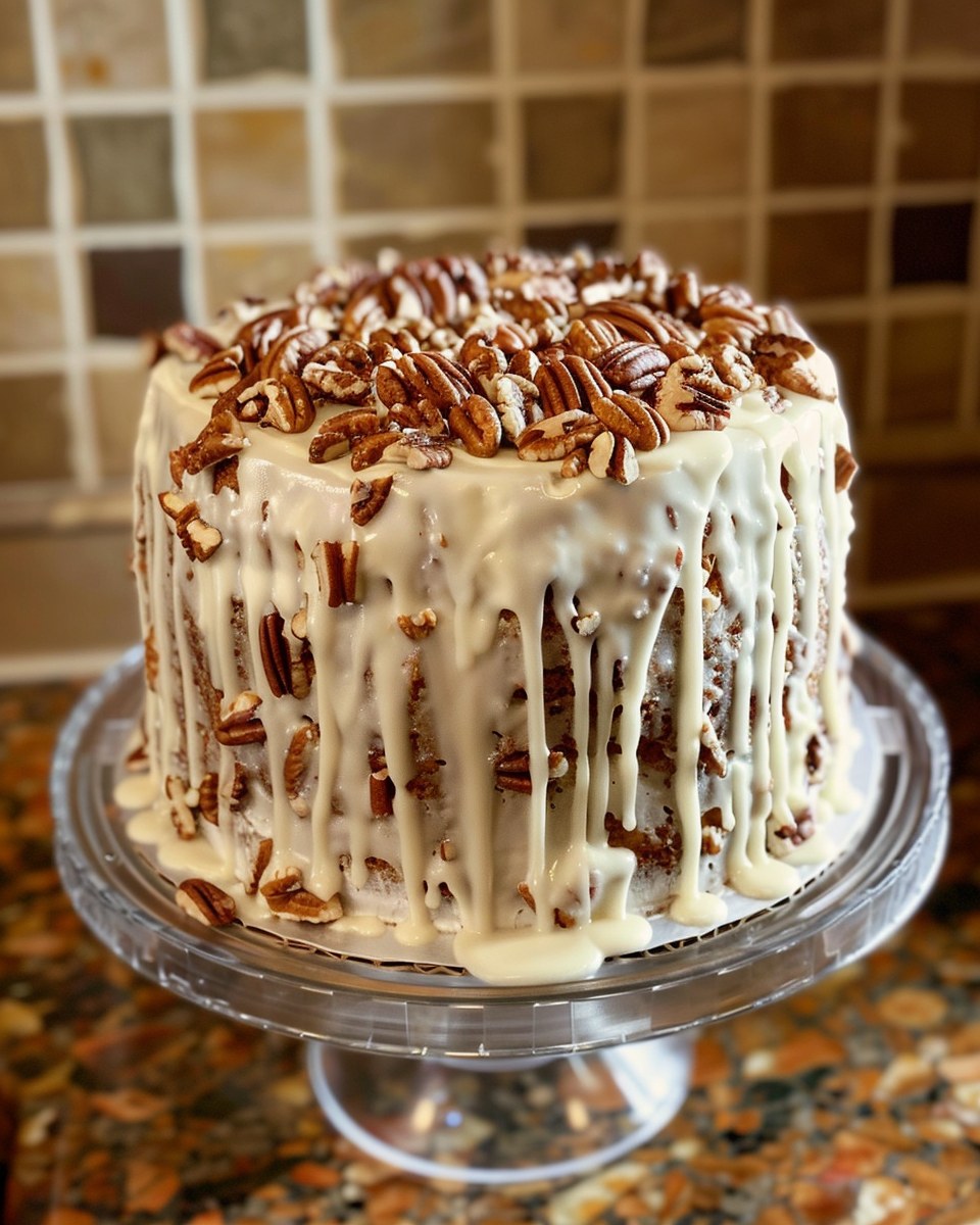 While glaze is still wet, sprinkle with plenty of pecan halves and chopped pecans for crunch and presentation.