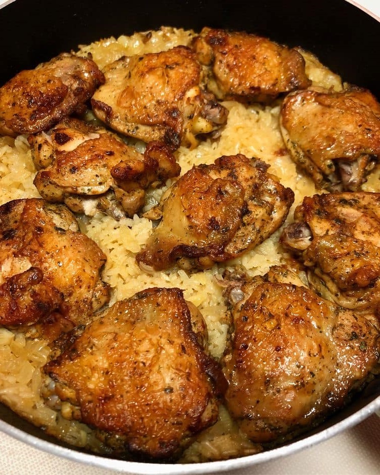 Stand for 5 minutes, then remove chicken and fluff up the rice. Garnish with parsley or thyme if desired, serve and enjoy!