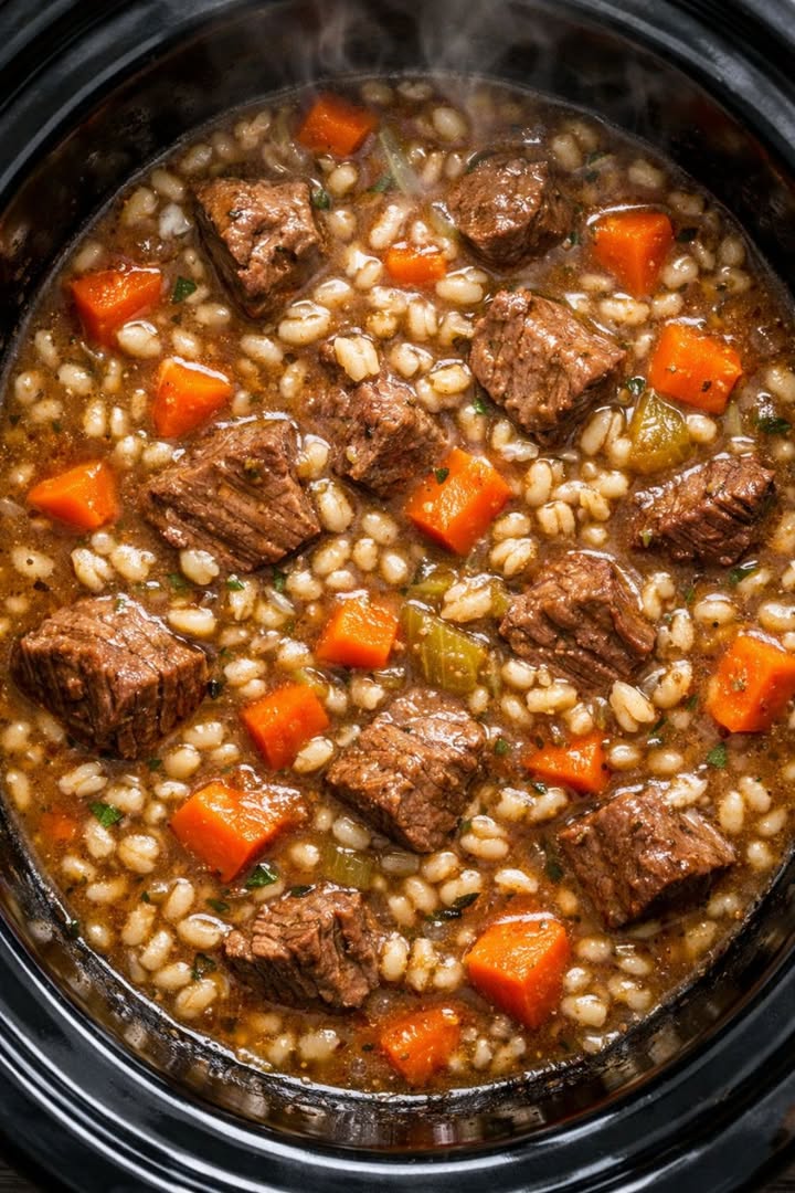 Cover and cook on LOW for 7–8 hours or HIGH for 4–5 hours, until the beef is tender and the barley is soft and fully cooked.