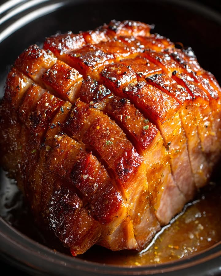 – Next make the glaze mixture, mixing together the honey, dijon and brown sugar together. Remove the ham from the slow cooker, score the fat all over in a criss cross pattern then pour that delicious glaze mixture all over the ham leaving 1-2 tbsp to drizzle over at the end.