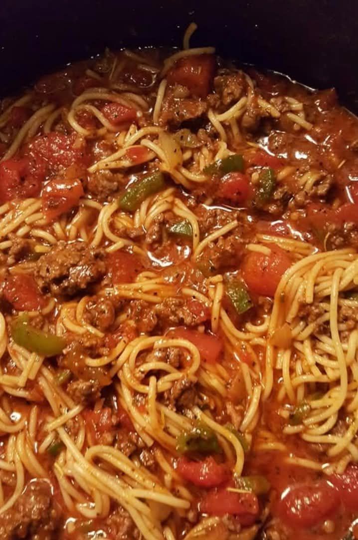 In an extra large heated skillet add olive oil, add diced onions and diced green peppers. Cook for about 5 to 7 minutes on medium heat then add 5 cloves of minced garlic. Cook until browned. Add ground chuck and cook until browned. Drain grease from meat. Add all seasoning and spices and stir to mix seasoning through the browned ground chuck. Add crushed and diced tomatoes and stir. Last add tomato sauce and stir. Turn heat to low and let simmer for 1 hour.