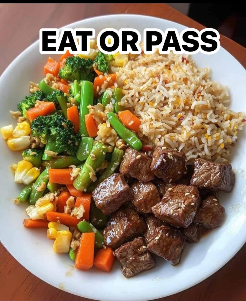 A hearty Asian-inspired dish with tender beef cubes, colorful stir-fried vegetables in a savory sauce, and fragrant fried rice with carrots and corn.