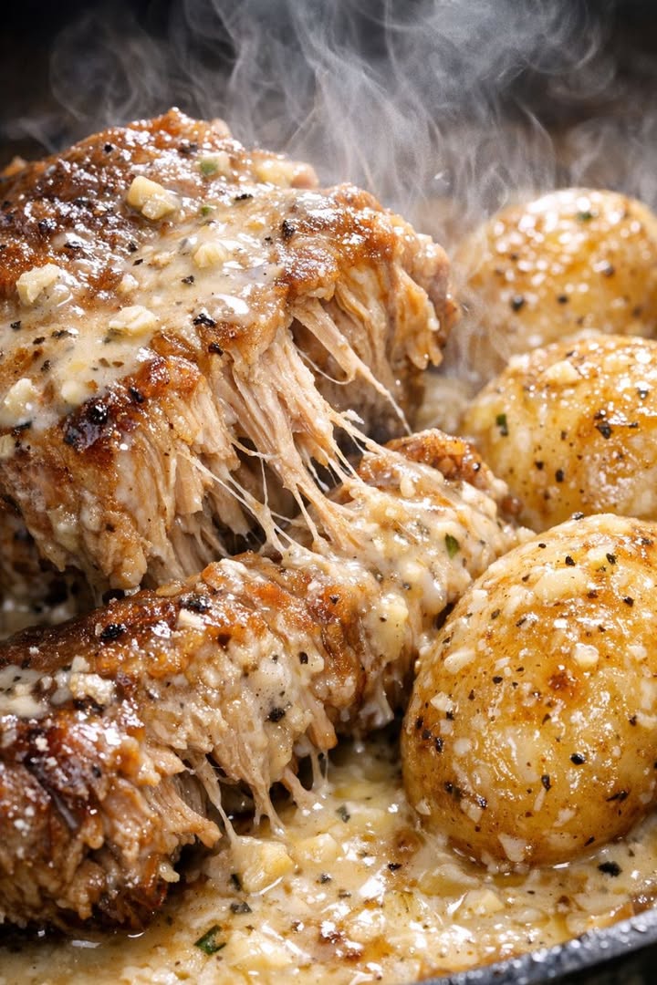 This slow cooker creamy garlic pork chops and potatoes recipe is my go-to when I want a Valentine’s-worthy dinner with almost no effort and only four ingredients. Thick-cut boneless pork chops slowly braise with potatoes in a rich, garlicky cream sauce until everything is tender, succulent, and spoon-soft. It’s a very American, homey take on classic cream-and-garlic pan sauces you’d find in a bistro, but streamlined for a weeknight: no browning, no flour, and almost no cleanup. You layer, pour, cover, and let the slow cooker do the work while your kitchen fills with the scent of garlic and cream.